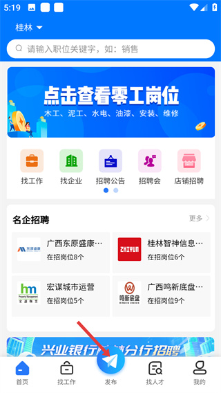 1、打開招聘APP首頁,點(diǎn)擊底部【發(fā)布】按鈕,進(jìn)入發(fā)布功能板塊。