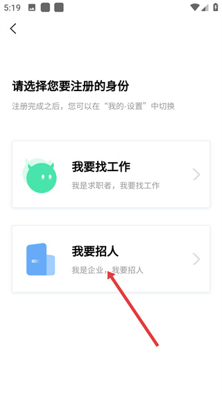 2、在身份選擇頁面,點(diǎn)擊【我要招人】選項(xiàng),選擇企業(yè)身份,進(jìn)入企業(yè)注冊(cè)的下一步操作。