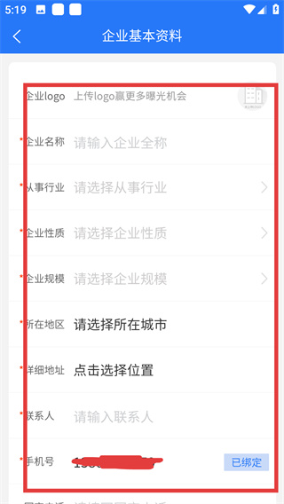 3、進(jìn)入【企業(yè)基本資料】頁面,填寫【企業(yè)logo】【企業(yè)名稱】【從事行業(yè)】等必填信息,確保內(nèi)容準(zhǔn)確完整。