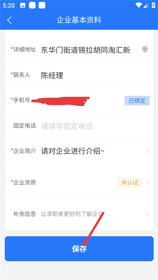 4、全部信息填寫完畢后,點(diǎn)擊底部【保存】按鈕,完成企業(yè)注冊(cè)操作即可進(jìn)入招聘信息的發(fā)布。
