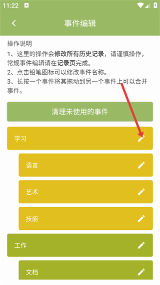 3、在【事件編輯】頁(yè)面,先查看操作說明,點(diǎn)擊事件右側(cè)的鉛筆圖標(biāo),即可觸發(fā)事件名稱的修改功能。