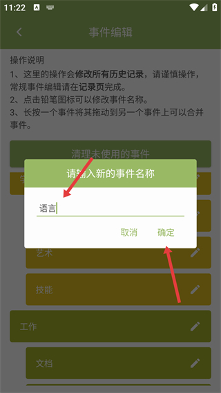 4、點(diǎn)擊鉛筆圖標(biāo)后彈出【請(qǐng)輸入新的事件名稱】彈窗,輸入內(nèi)容后點(diǎn)擊【確定】按鈕,完成事件名稱的修改。