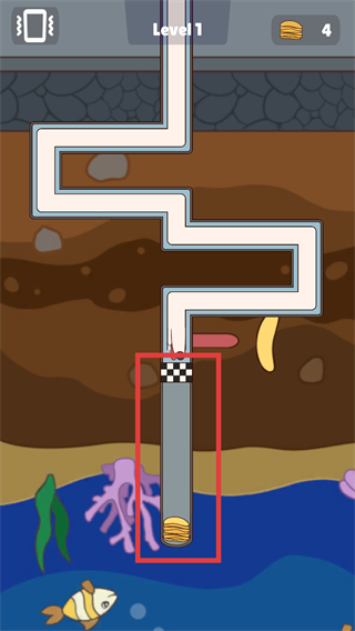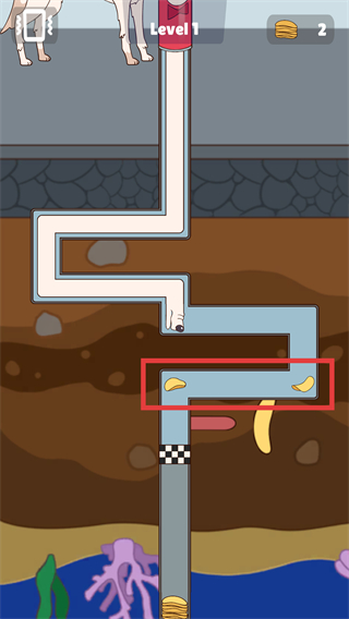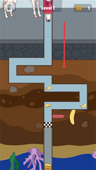 1、在【Level-1】中,長嘴狗沿管道向下移動,收集沿途的食物。