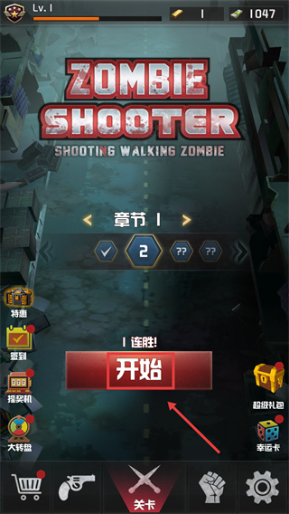 1、進入【ZOMBIE-SHOOTER】界面后,選擇【章節(jié)-1】的第2關,點擊【開始】按鈕進入關卡,推進游戲進度。