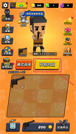 1、進(jìn)入界面后先領(lǐng)取【技能和獎勵】,選擇【開始對戰(zhàn)】進(jìn)入對局。