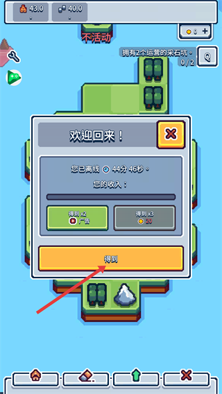 1、登錄后點擊【得到】按鈕,領(lǐng)取離線積累的收益,快速獲取初始資源。