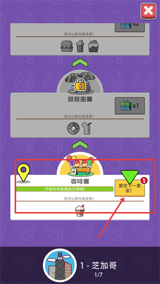 2、完成當前攤位的經(jīng)營目標后,解鎖新攤位(如【甜甜圈攤】),點擊【前往下一家店】推進至新經(jīng)營場景。