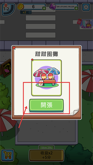 3、在新場景中點擊【開張】按鈕,開啟【甜甜圈攤】的經(jīng)營權(quán)限,解鎖新的商品銷售與收益渠道。